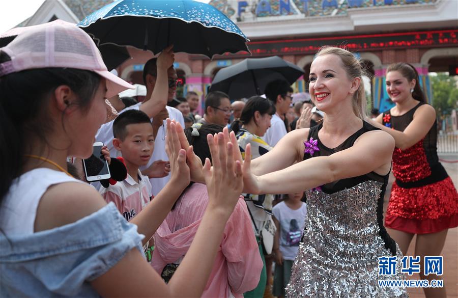 7月31日,列娜(右二)表演后與游客互動。新華社記者龍雷攝