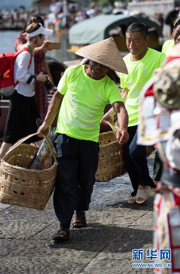 7月27日,在西昌邛海,漁民提著捕到的大魚準(zhǔn)備參加比賽。新華社記者江宏景攝