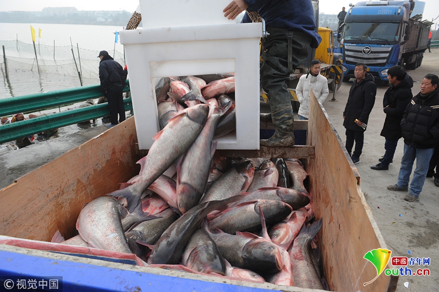2019年1月6日,安徽省阜陽(yáng)市潁上縣八里河漁場(chǎng)正式開始進(jìn)行冬季大捕魚,捕獲的一條重達(dá)78斤的“頭魚”拍出88萬(wàn)元,現(xiàn)場(chǎng)吸引眾多客商和廣大群眾觀看。