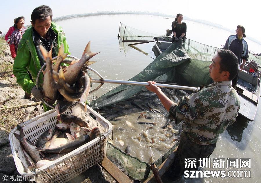 江蘇揚(yáng)州,漁夫?qū)Ⅳ~撈出過(guò)秤。