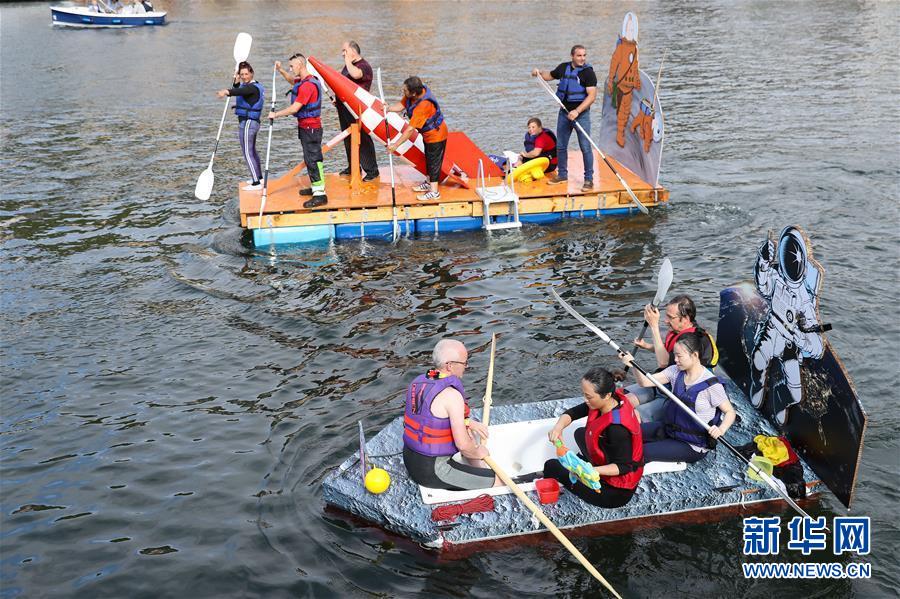 8月15日,在比利時南部小城迪南的默茲河上,人們參加“浴缸劃船節(jié)”的表演。新華社記者 張鋮 攝