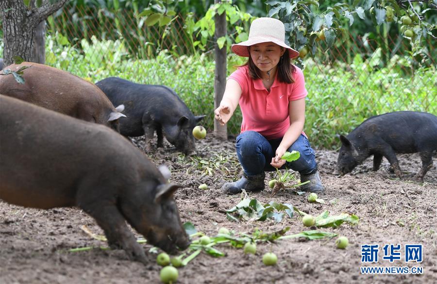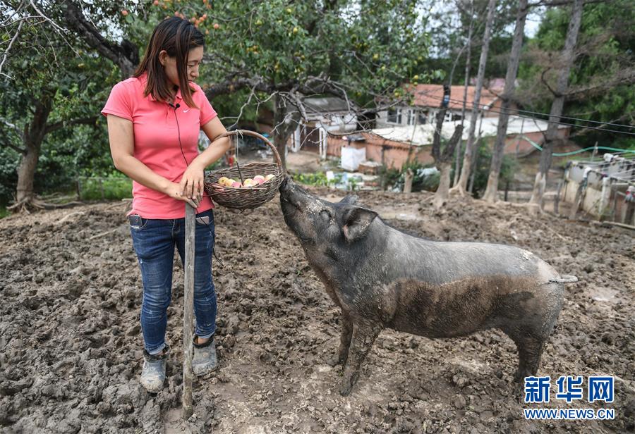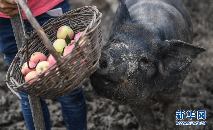 8月20日,康丹丹在果園內(nèi)喂豬吃蘋果梨。新華社記者 王昊飛 攝