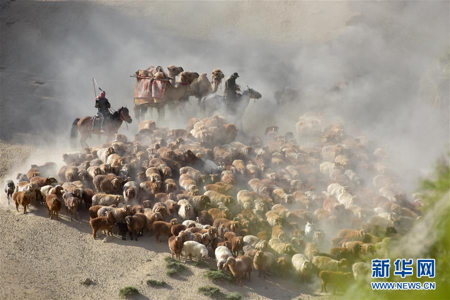 族牧民整理好行裹,抱著孩子,趕著牛羊,浩浩蕩蕩向秋牧場遷徙。