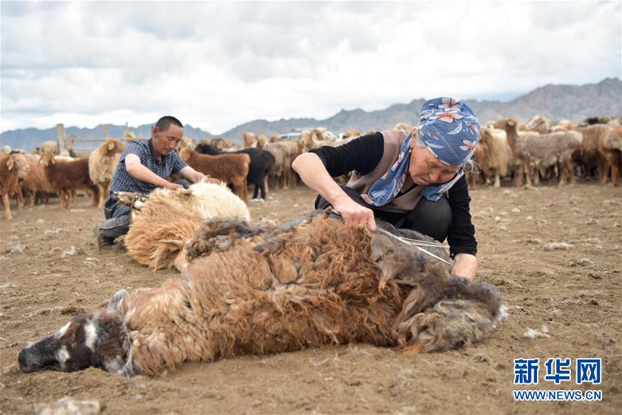 牧民趕著牛羊轉場到夏季牧場,安頓妥當后的第一個工作就是給羊剪羊毛(6月7日攝)。新華社記者丁磊攝
