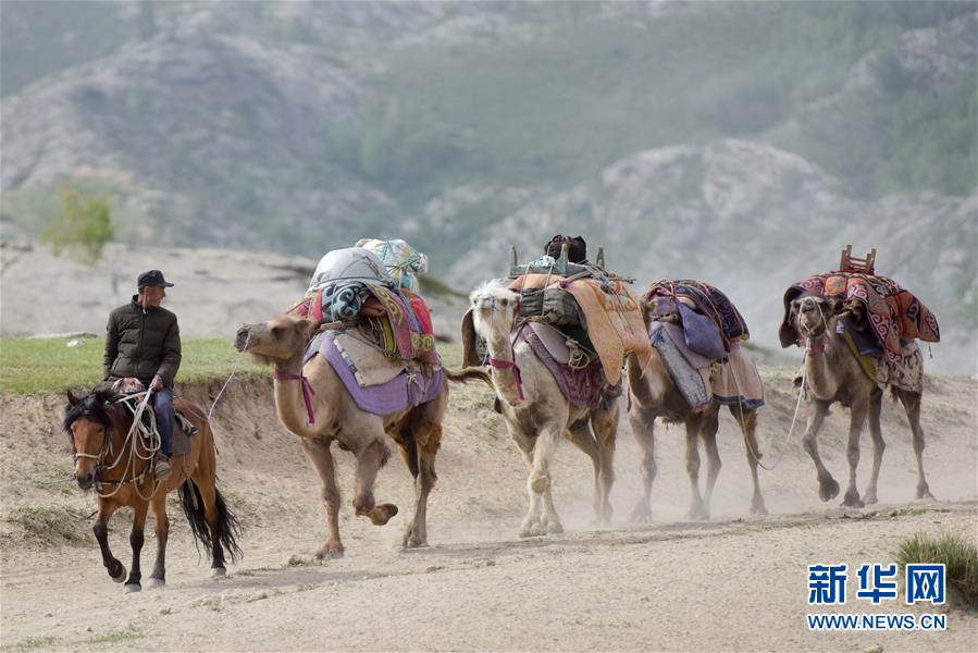 新疆阿勒泰地區(qū)福??h牧民帶著駝隊行進在轉場途中(6月6日攝)。新華社記者丁磊攝