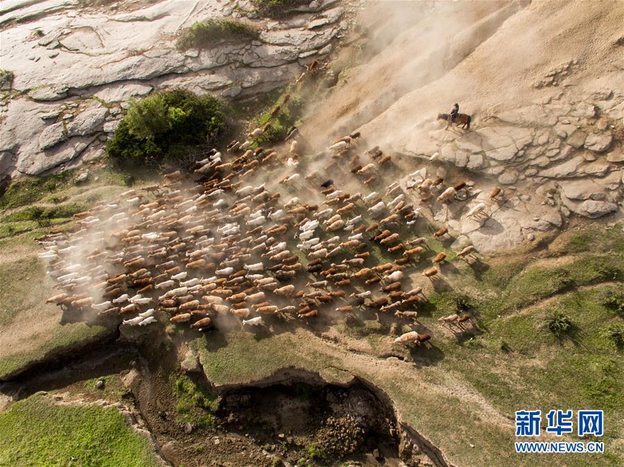6月6日,新疆阿勒泰地區(qū)福??h牧民趕著轉場牲畜翻越山頭。 新華社記者 丁磊 攝