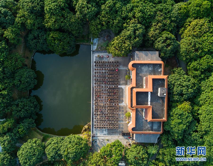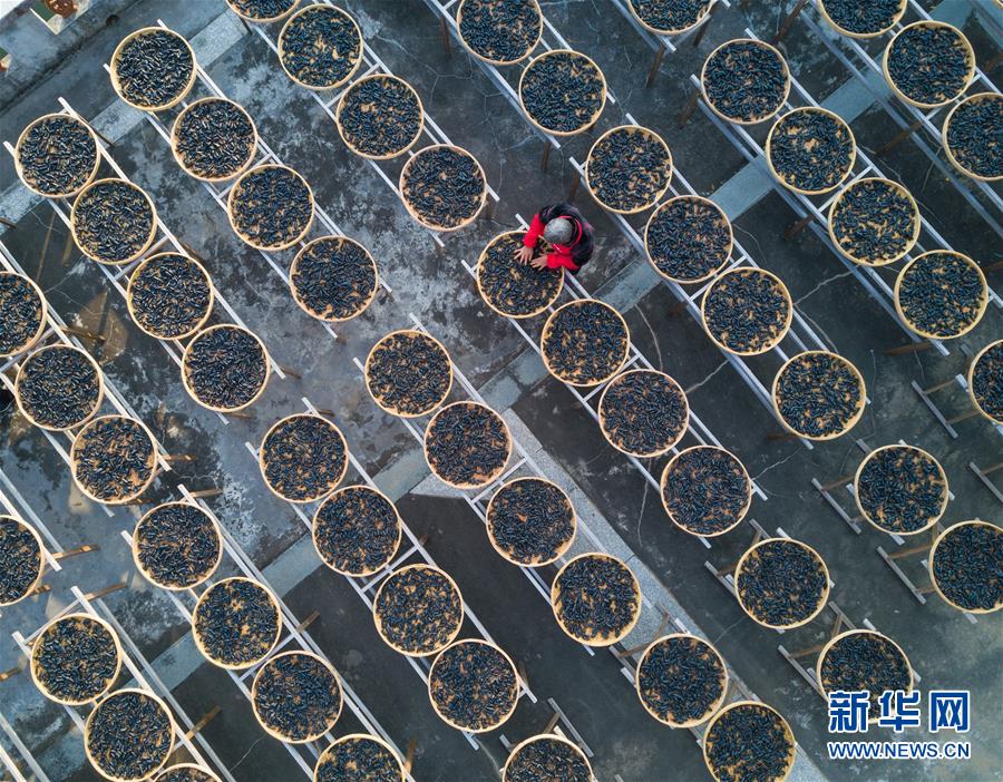 在福建省永春縣岵山鎮(zhèn)茂霞村熟地文創(chuàng)園,村民在晾曬用當(dāng)?shù)貍鹘y(tǒng)手藝制作的藥材——熟地(1月28日無人機拍攝)。  新華社記者 宋為偉 攝