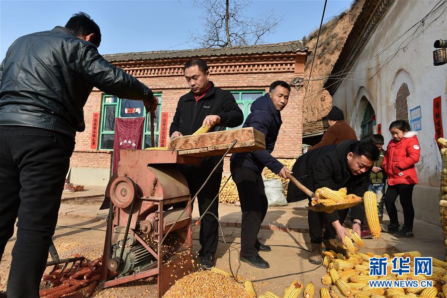 在武鄉(xiāng)縣大有鄉(xiāng)王莊溝村,駐村第一書記靳建中(左二)和扶貧工作隊隊員徐乃勤(左三)、常建林(左四)在村民家里幫助村民給玉米脫粒(2月17日攝)。  新華社記者 詹彥 攝
