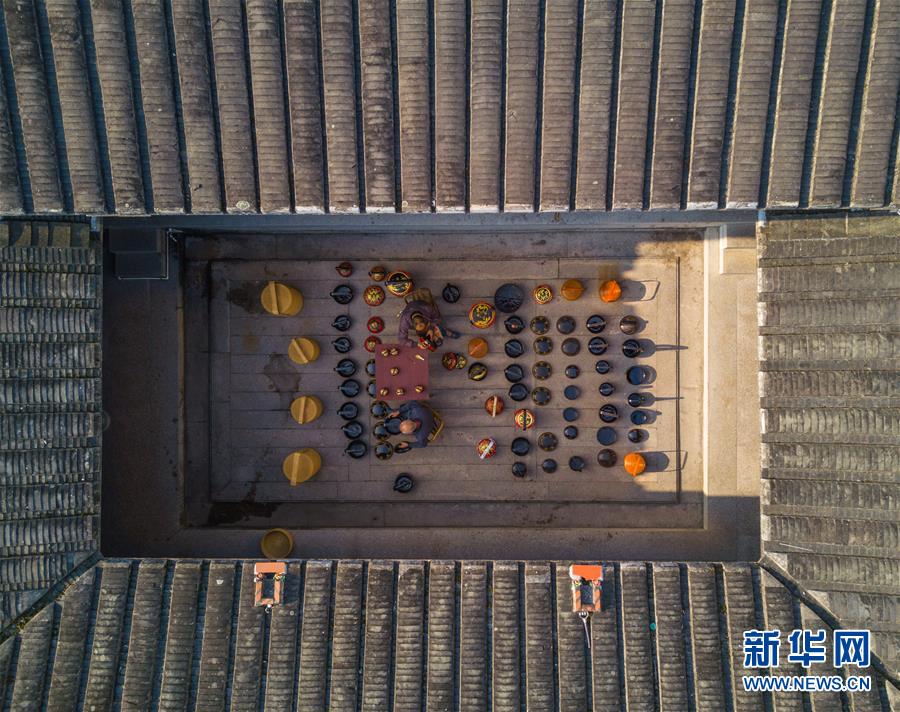在福建省永春縣仙夾鎮(zhèn)龍水村,村民在老宅制作當(dāng)?shù)靥厣峄@(1月28日無人機拍攝)。 新華社記者 宋為偉 攝