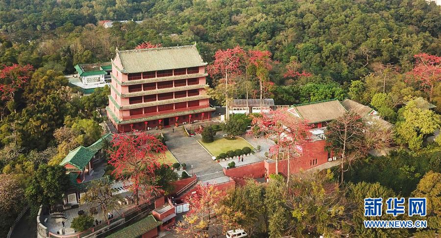 盛開的木棉花和坐落在廣州越秀山上的鎮(zhèn)海樓交相輝映(2月22日無(wú)人機(jī)拍攝)。 新華社記者 鄧華 攝