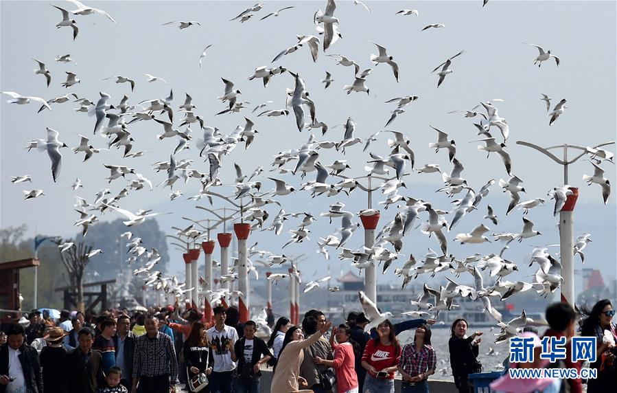 人們?cè)诶ッ鞯岢剡吪c紅嘴鷗嬉戲(2016年3月15日攝)。 新華社記者 藺以光 攝