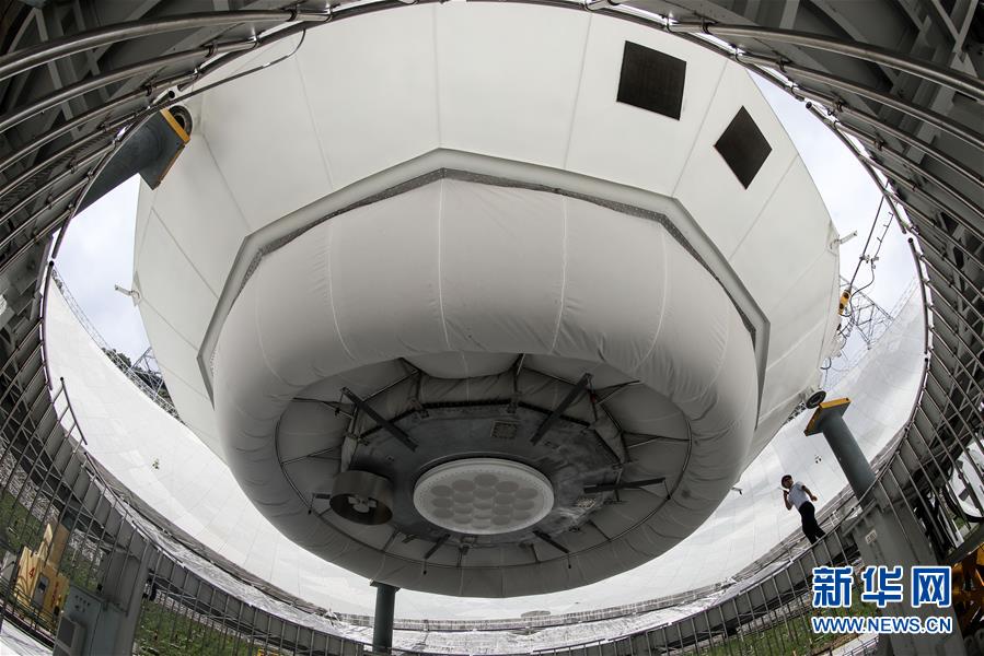 8月28日,工作人員在FAST饋源艙內(nèi)進(jìn)行檢修。 新華社記者 歐東衢 攝