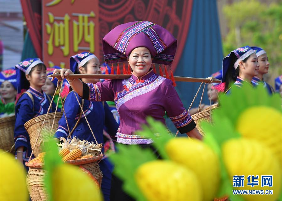 9月17日,廣西都安瑤族自治縣密洛陀文化公園廣場,演員在啟動儀式上表演節(jié)目《在希望的田野上》。 當(dāng)日,2019年廣西慶祝“中國農(nóng)民豐收節(jié)”啟動儀式暨河池市“慶豐收·促脫貧”系列活動在都安瑤族自治縣舉行,各族群眾和來賓一起載歌載舞歡慶豐收節(jié)。 新華社記者 陸波岸 攝