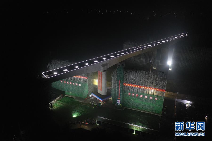 這是8月27日凌晨無人機(jī)拍攝的轉(zhuǎn)體完成的橋梁。新華社記者邢廣利攝