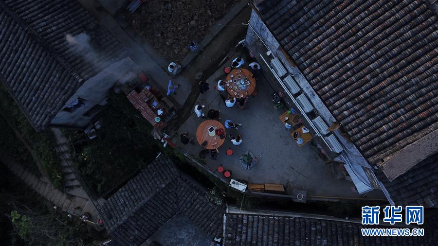 游客在木梨硔村吃早點(9月18日無人機拍攝)。新華社記者張端攝