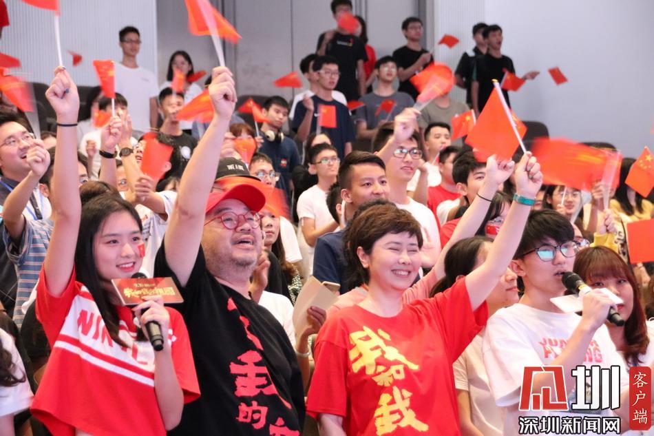導演張一白和薛曉路和深圳大學學子揮舞五星紅旗,唱響電影主題曲。
