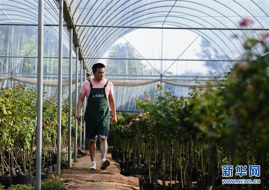 在沭陽縣新河鎮(zhèn)新槐村,張炎在花卉大棚內(nèi)查看月季花長(zhǎng)勢(shì)(8月24日攝)。 新華社記者 李響 攝