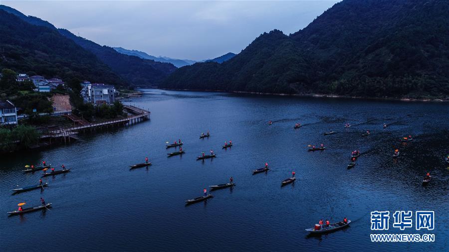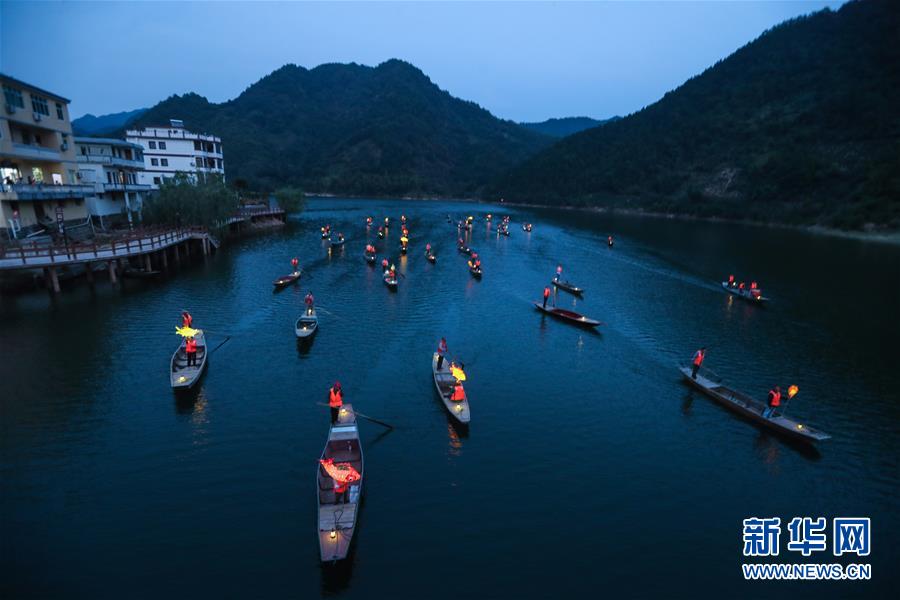 9月25日,在宋村鄉(xiāng)云源港的水面上,漁民劃著漁船,船頭點亮漁燈,構成一幅“漁舟唱晚、萬家燈火”的美麗圖景(無人機拍攝)。 近年來,浙江省杭州市淳安縣宋村鄉(xiāng)積極發(fā)展鄉(xiāng)村旅游,打造漁家元素特色景觀,助力鄉(xiāng)村振興建設。目前,宋村鄉(xiāng)依托山水景觀和漁家文化,帶動了當?shù)鼐访袼藓图碁╂宜?、自助燒烤、農(nóng)事體驗、民俗攝影采風為一體的特色旅游發(fā)展。2019年1月初至7月底,全鄉(xiāng)接待游客10萬人次,實現(xiàn)旅游經(jīng)濟收入1300萬元。 新華社記者 徐昱 攝