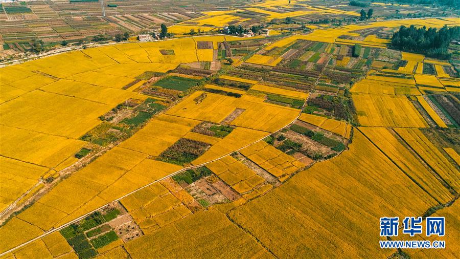 這是9月30日無人機(jī)拍攝的河北省涉縣白芟村的稻田。 近日,位于太行山下的河北省涉縣白芟村上千畝水稻逐漸成熟。從空中俯瞰,猶如一塊塊“調(diào)色盤”,美不勝收。 新華社記者 王曉 攝