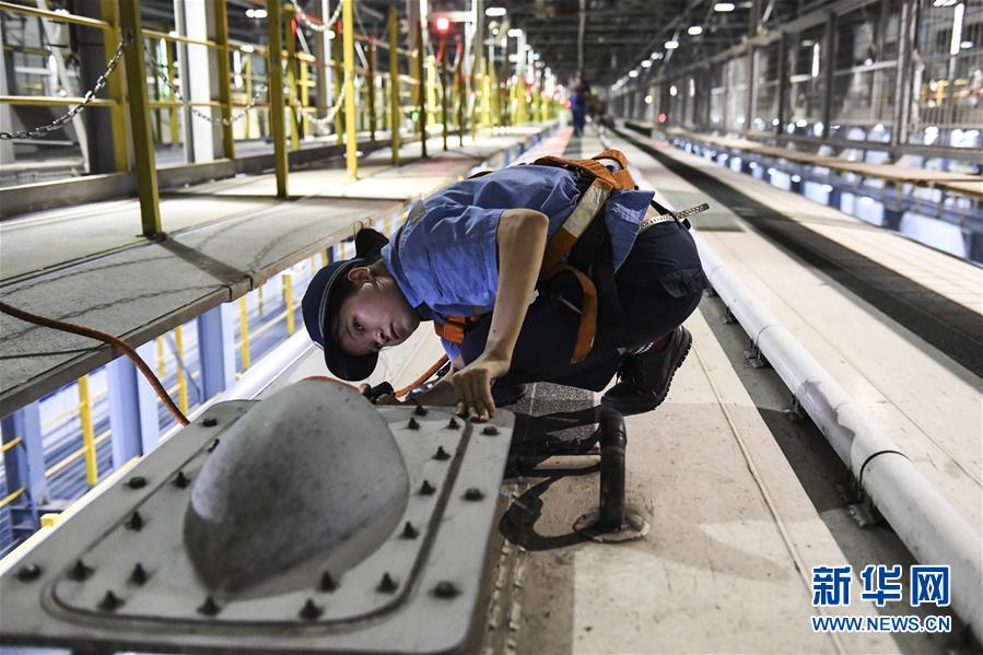 “動(dòng)車醫(yī)生”在對車頂?shù)腇M天線進(jìn)行檢查(10月2日攝)。 新華社記者 曹祎銘 攝