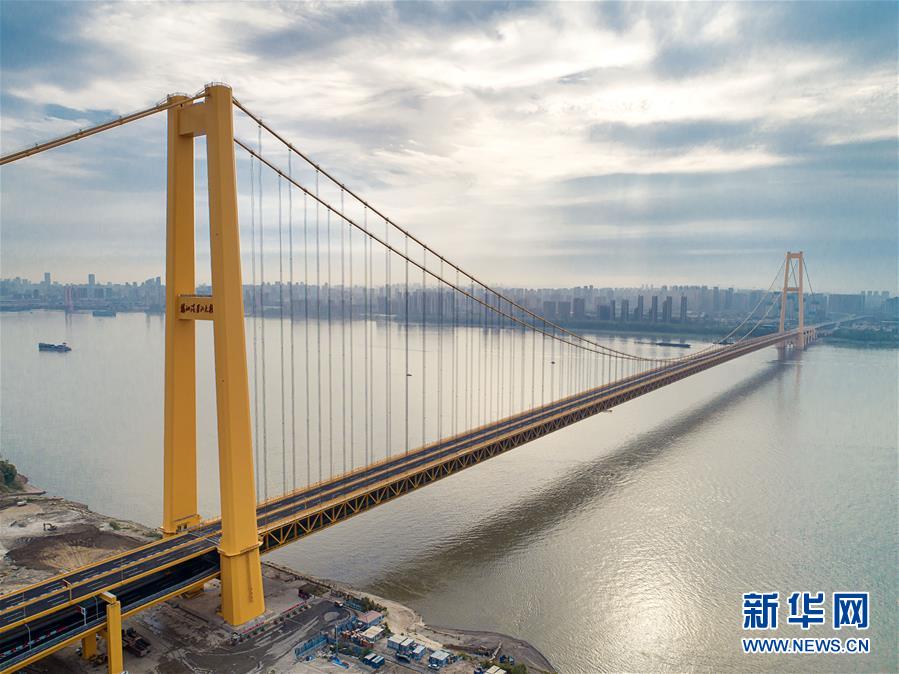 楊泗港大橋建設(shè)創(chuàng)造了多項(xiàng)世界之最:一是主橋跨度達(dá)1700米,為世界上跨度最大的雙層懸索橋;二是主橋設(shè)置雙層雙向12車道,是世界上通行能力最大的公路橋梁;三是大橋主纜設(shè)計(jì)張力6.5萬(wàn)噸,采用了世界上強(qiáng)度等級(jí)最高的主纜鋼絲;四是大橋設(shè)置機(jī)動(dòng)車道、非機(jī)動(dòng)車道、人行觀光道,集過江交通與觀光于一體,是長(zhǎng)江上功能最完備的橋梁。新華社記者熊琦攝
