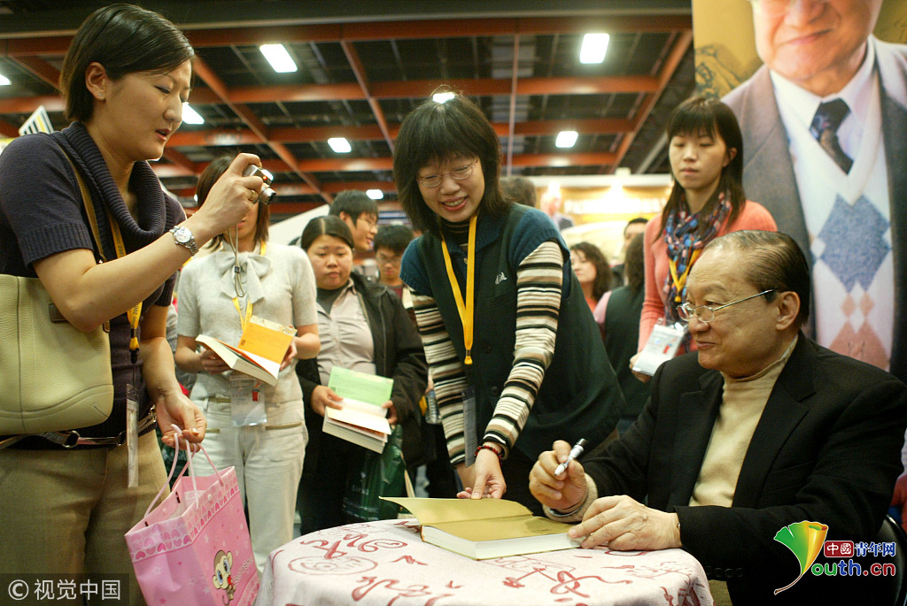 2007年2月2日上午,臺(tái)灣,武俠小說大師金庸現(xiàn)身臺(tái)北國際書展為書迷簽名,許多讀者除了拿小說來簽名外,還帶著相機(jī)來拍照。圖片作者:聯(lián)合知識(shí)庫