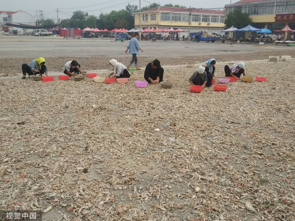 2019年9月13日,農(nóng)歷八月十五中秋節(jié),山東濱州沾化區(qū)魯北海產(chǎn)品批發(fā)市場(chǎng),村民正在分揀貨物。