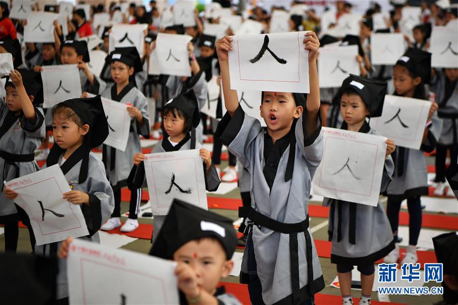 10月13日,參加儀式的小朋友在書寫“人”字。當(dāng)日,??诤嬌賰核囆g(shù)中心為500名小朋友舉行“開筆禮”,通過“點朱砂,啟智慧”“習(xí)書法,描人字”等儀式讓孩子們體驗中國傳統(tǒng)文化。新華社記者郭程攝