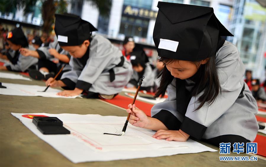 10月13日,參加儀式的小朋友在蘸墨寫字。當(dāng)日,??诤嬌賰核囆g(shù)中心為500名小朋友舉行“開筆禮”,通過“點朱砂,啟智慧”“習(xí)書法,描人字”等儀式讓孩子們體驗中國傳統(tǒng)文化。新華社記者郭程攝
