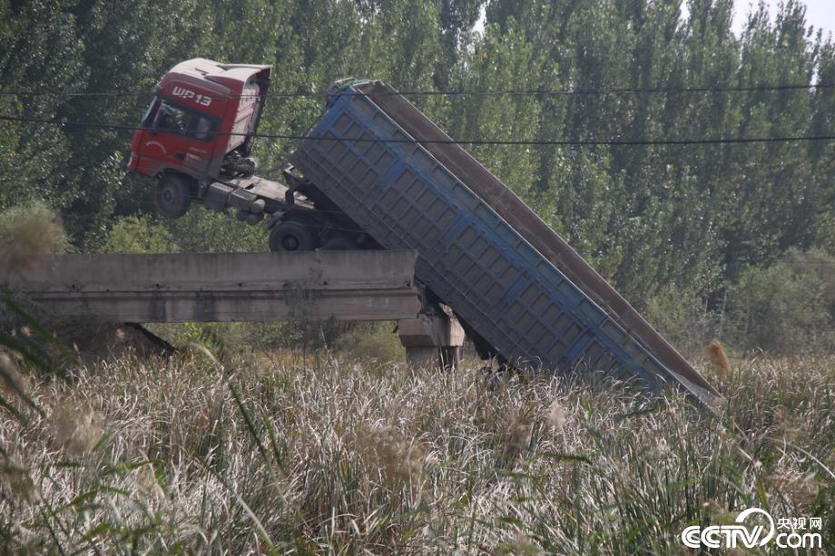 2019年10月13日,山東濱州,一輛滿載貨物的大貨車路過當(dāng)?shù)匾蛔鶎?米左右的小橋時,致使橋面坍塌。據(jù)報道,13日凌晨4點左右,一輛重型半掛貨車沿渤海十八路由南向北行駛至市西辦事處李茂家村附近,右轉(zhuǎn)彎進(jìn)入連接渤海十八路與李茂家村村西鄉(xiāng)間路的一座寬4米左右的小橋時,致使橋面坍塌?,F(xiàn)場貨車呈翹起之勢,車頭懸于半空中,車尾插入水中,事故未造成人員傷亡。據(jù)現(xiàn)場了解,該橋建設(shè)于1974年,橋頭有警示標(biāo)識,警示承載4噸。目前救援工作正在緊張有序地進(jìn)行中。視覺中國