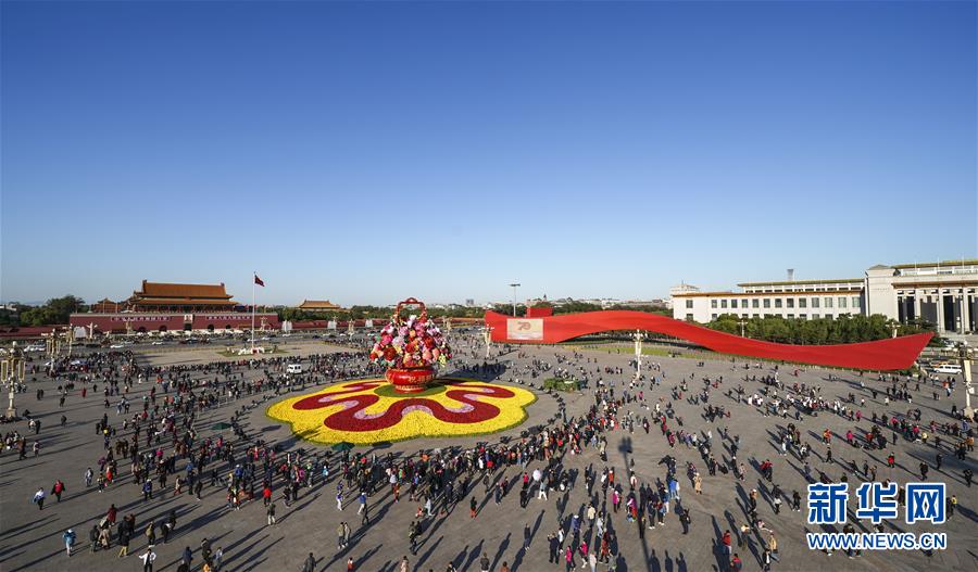 這是10月14日拍攝的天安門廣場中心花壇。 10月14日,以“花果籃”為主造型的天安門廣場中心花壇吸引了眾多游客參觀拍照?!盎ü@”的夜景更是流光溢彩,絢爛迷人。 新華社記者 殷剛 攝