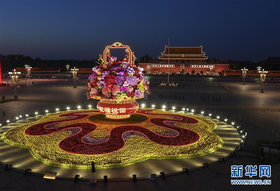 這是10月14日拍攝的天安門(mén)廣場(chǎng)中心花壇。 10月14日,以“花果籃”為主造型的天安門(mén)廣場(chǎng)中心花壇吸引了眾多游客參觀拍照。“花果籃”的夜景更是流光溢彩,絢爛迷人。 新華社記者 殷剛 攝