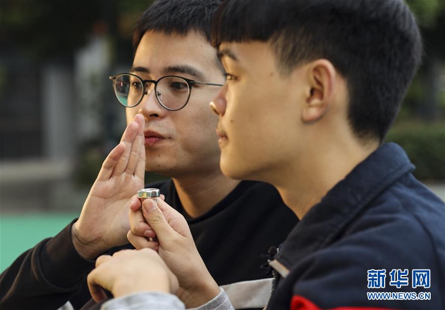 重慶市特殊教育中心老師李沂念(左一)在教授盲童王太樊練習小號吹奏的氣息(10月10日攝)。 新華社記者 劉潺 攝