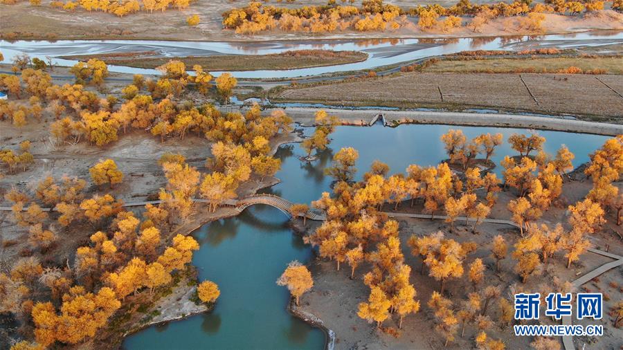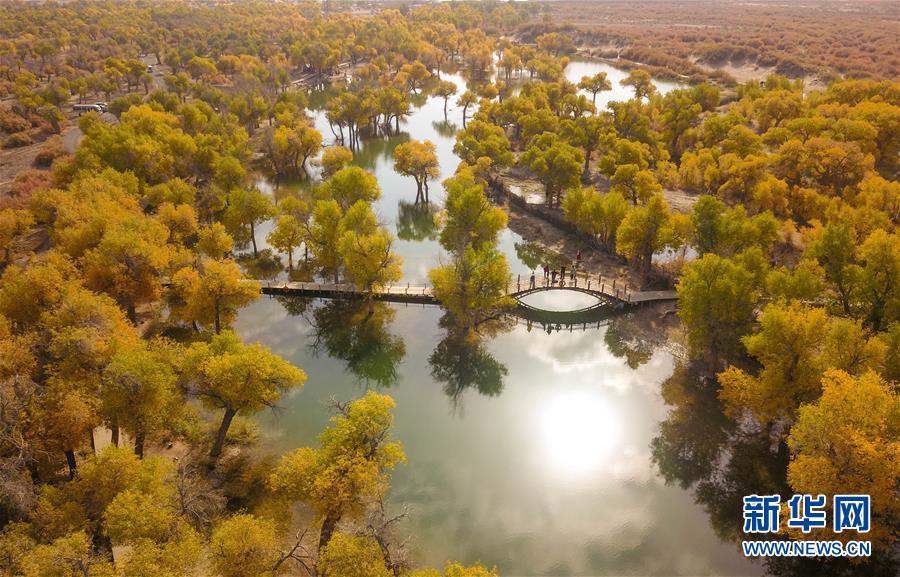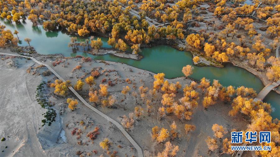 10月16日無(wú)人機(jī)拍攝的內(nèi)蒙古阿拉善盟額濟(jì)納旗境內(nèi)的胡楊林。新華社記者彭源攝
