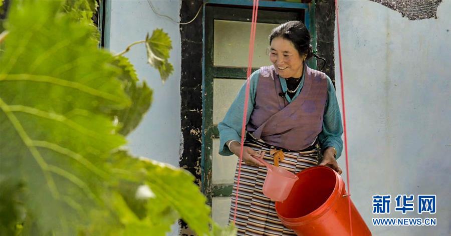 贊堂社區(qū)居民扎桑在給自家的植物澆水(9月16日攝)。 新華社記者 洛卓嘉措 攝