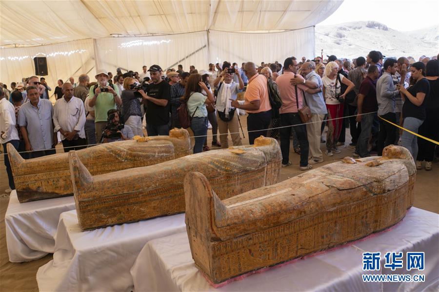 這是10月19日在埃及盧克索拍攝的近期發(fā)掘出的棺槨。 埃及文物部19日在南部城市盧克索舉行的新聞發(fā)布會上宣布,埃及考古隊近期發(fā)掘出30具3000年前的木質(zhì)棺槨。 新華社記者 李碧念 攝