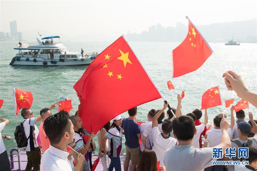 10月1日,香港市民在維多利亞港參加巡游。當(dāng)日,約300名香港市民以游船方式慶祝新中國成立70周年。 新華社記者翁忻旸攝