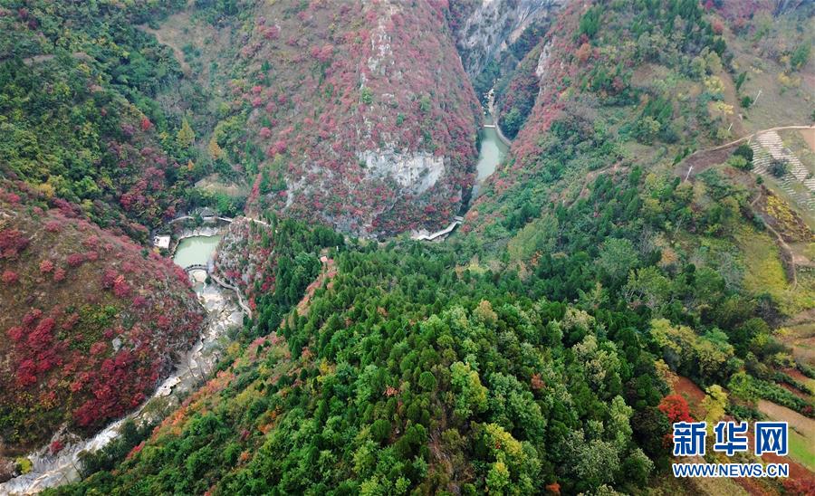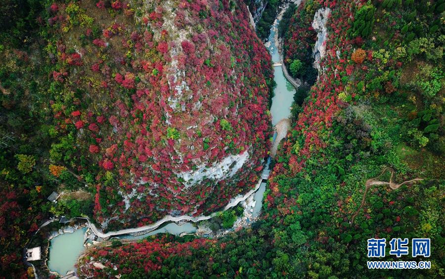 這是10月19日無人機(jī)拍攝的河北省涉縣太行紅葉大峽谷景色。新華社記者王曉攝