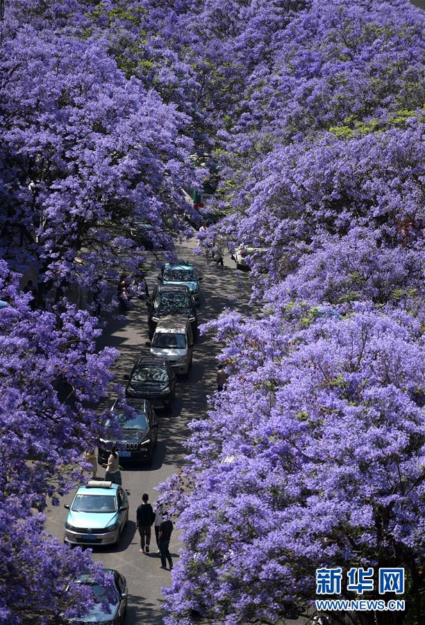 昆明市教場(chǎng)中路一帶的藍(lán)花楹進(jìn)入盛花期(4月24日攝)。新華社記者秦晴攝