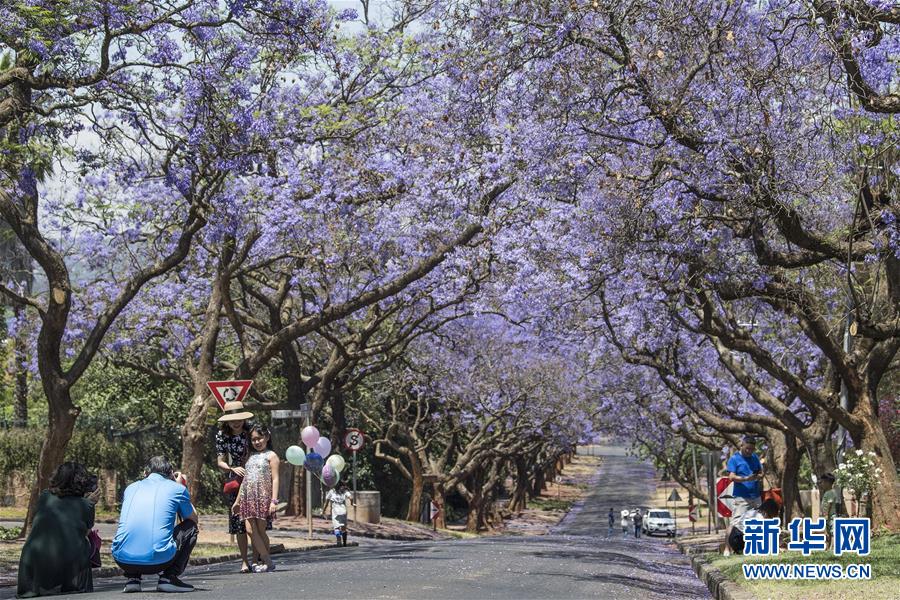 10月20日,在南非比勒陀利亞,游人在藍(lán)花楹樹(shù)下拍照。新華社記者陳誠(chéng)攝