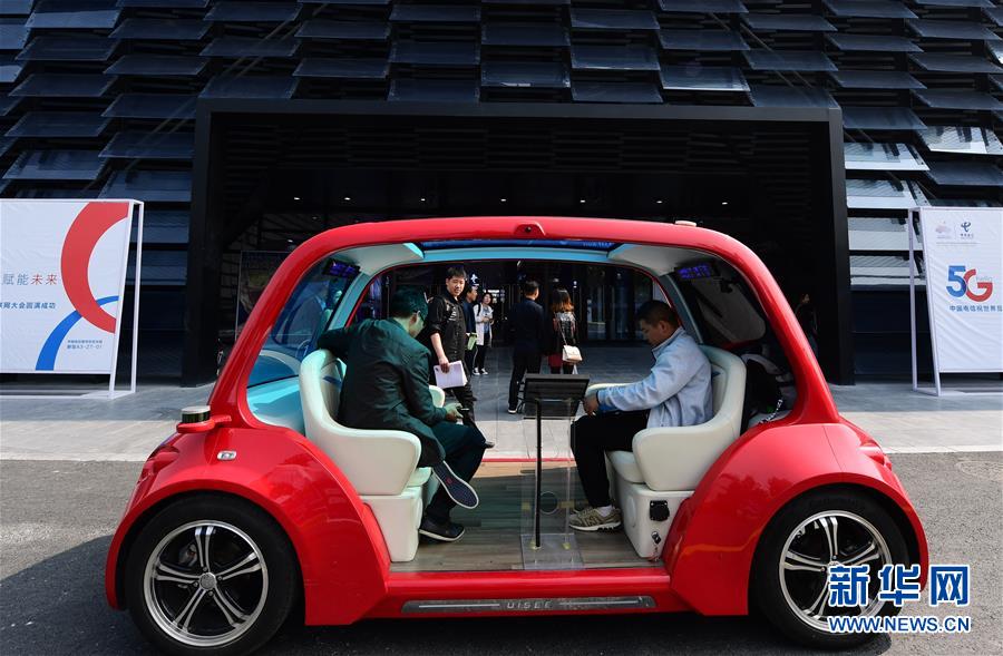 10月21日在浙江烏鎮(zhèn)舉行的互聯(lián)網(wǎng)之光博覽會(huì)會(huì)場(chǎng)外拍攝的5G無(wú)人駕駛體驗(yàn)車。新華社記者尹棟遜攝