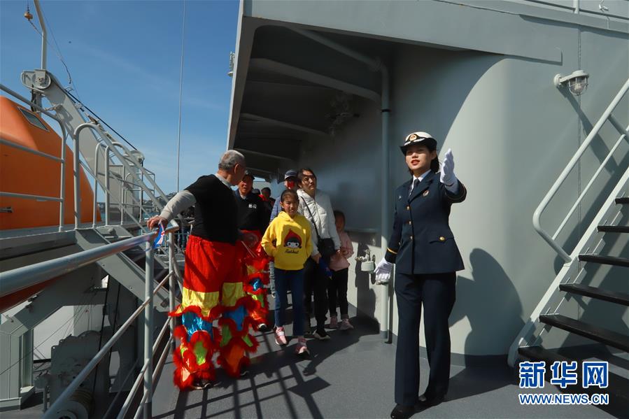 10月26日,在新西蘭首都惠靈頓,中國海軍訓(xùn)練艦戚繼光艦的學(xué)員為參觀群眾進行講解。新華社發(fā)(張雪山攝)