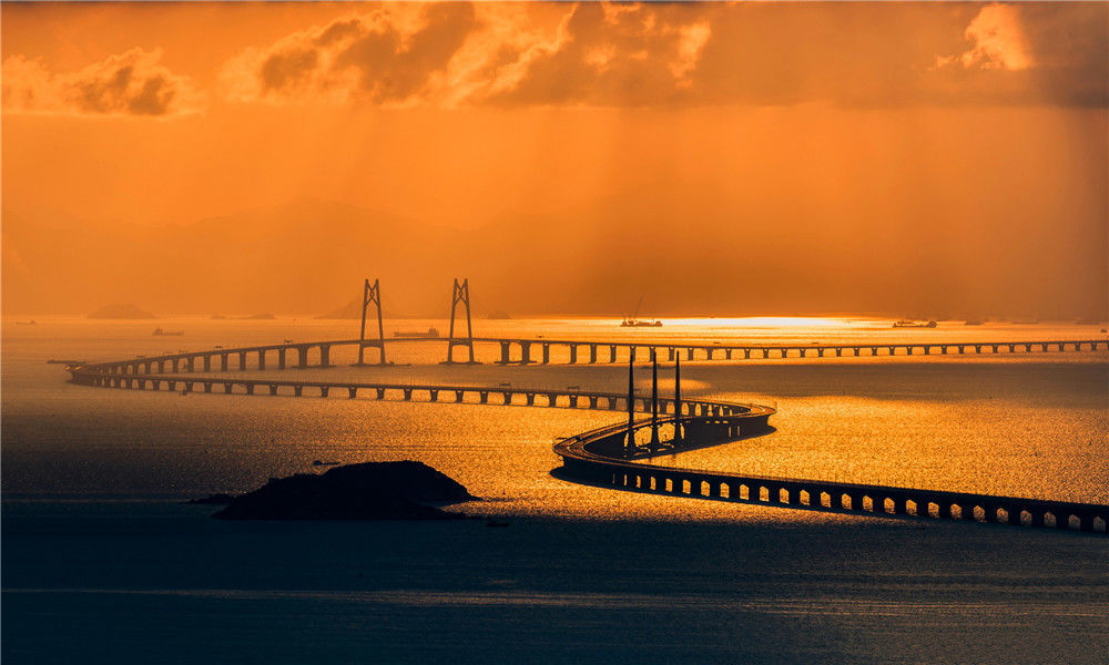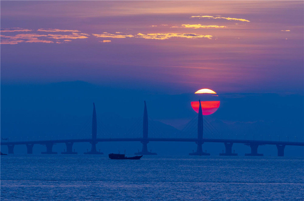 2018年10月22日早晨,從廣東珠海市的情侶路向東眺望,一輪紅日從東方冉冉升起,將港珠澳大橋映射得格外迷人?!俺?jí)工程”港珠澳大橋?qū)⒂?4日上午9時(shí)正式通車。張煒(香港分社)/中新社/視覺中國