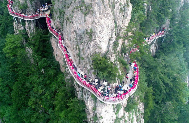 2018年7月8日,河南洛陽老君山舉行觀海避暑節(jié),在半山腰海拔2000米的懸崖棧道上安排了一場“云海盛宴”,設(shè)下免費(fèi)午餐,讓民眾免費(fèi)品嘗蘑菇山珍、大蝦、時(shí)令水果、新鮮果汁,精美點(diǎn)心等。DF/視覺中國