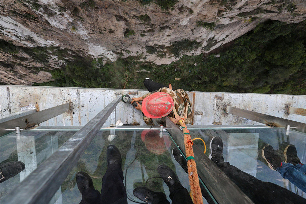 2019年9月20日,從落差198米懸崖上伸出周長(zhǎng)60米懸空的“高空玻璃懸廊”在河南南陽(yáng)七峰山落成,該玻璃懸廊名為“云頂之心”。圖為建筑工人進(jìn)行收尾工作。王中舉(河南分社)/中新社/視覺中國(guó)編輯/康娜