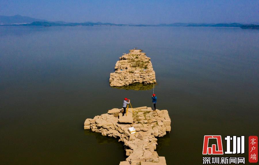 2019年10月30日,江西仙女湖旅游股份有限公司測量人員乘坐工作船對明代萬年橋進行測量,該橋橋身凸出水位最高處達1.64米。