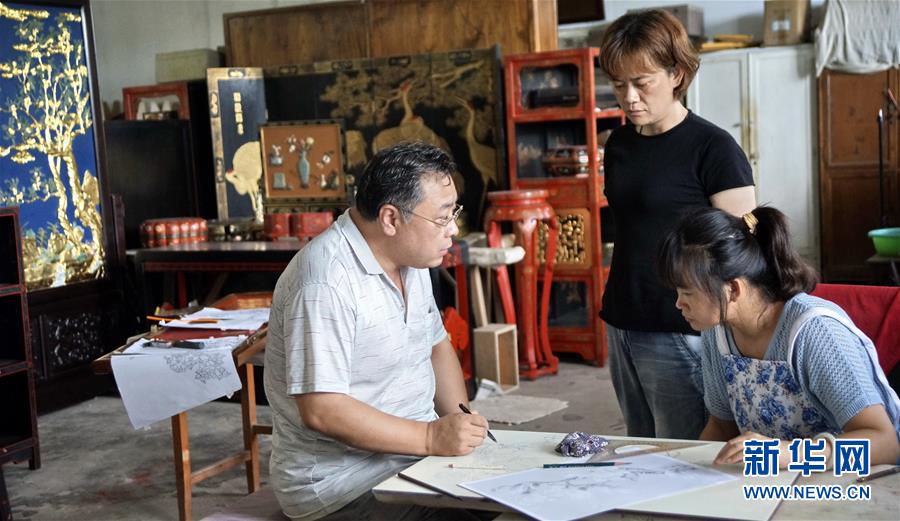 北京金漆鑲嵌有限責(zé)任公司工藝美術(shù)大師王學(xué)兵(左)在和技師們交流漆畫創(chuàng)作(10月31日攝)。新華社記者李欣攝