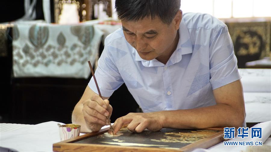 北京金漆鑲嵌有限責任公司工藝美術大師敖明在創(chuàng)作描金漆畫(10月31日攝)。新華社記者李欣攝