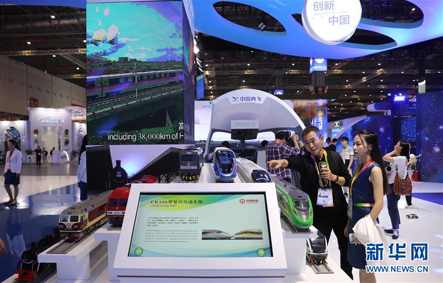11月2日,在第二屆中國國際進(jìn)口博覽會(huì)國家展展區(qū)內(nèi)的中國館,工作人員在一組中國鐵路展品旁討論交流。 新華社記者 方喆攝