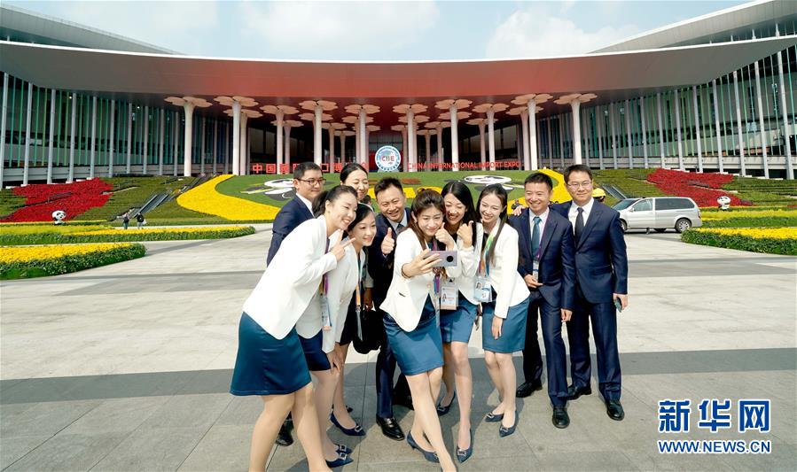 11月4日,第二屆中國國際進(jìn)口博覽會(huì)中國館的工作人員在國家會(huì)展中心(上海)南廣場(chǎng)合影。新華社記者 陳建力 攝